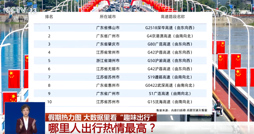 您知道哪里的人出行熱情高嗎?有網(wǎng)友說(shuō),聰明人都提前出門(mén)了。高德交通大數(shù)據(jù)顯示,10月1日0點(diǎn)至10點(diǎn),全國(guó)十大繁忙出程高速路段中,長(zhǎng)三角與粵港澳大灣區(qū)各占一半。其中,廣東的高速、火車(chē)站、機(jī)場(chǎng)等繁忙程度全面領(lǐng)跑全國(guó)。同時(shí)段全國(guó)十大繁忙高速服務(wù)區(qū)中,廣東占8席,江蘇占2席,廣東人的長(zhǎng)假出門(mén)熱情領(lǐng)跑全國(guó)。